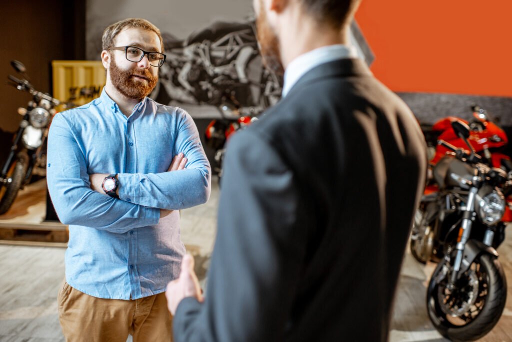 Sales consultant with a client choosing sports motorcycle to buy in the showroom
